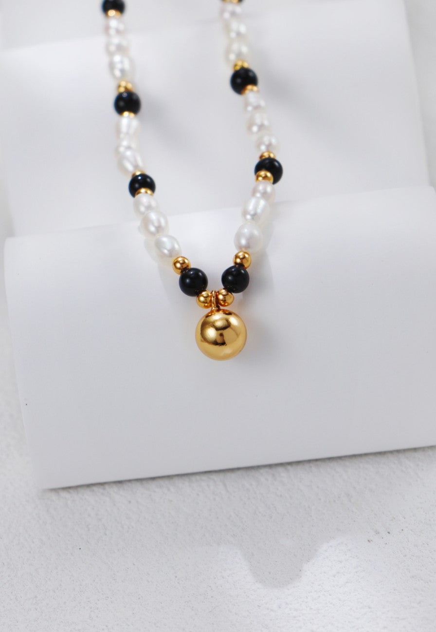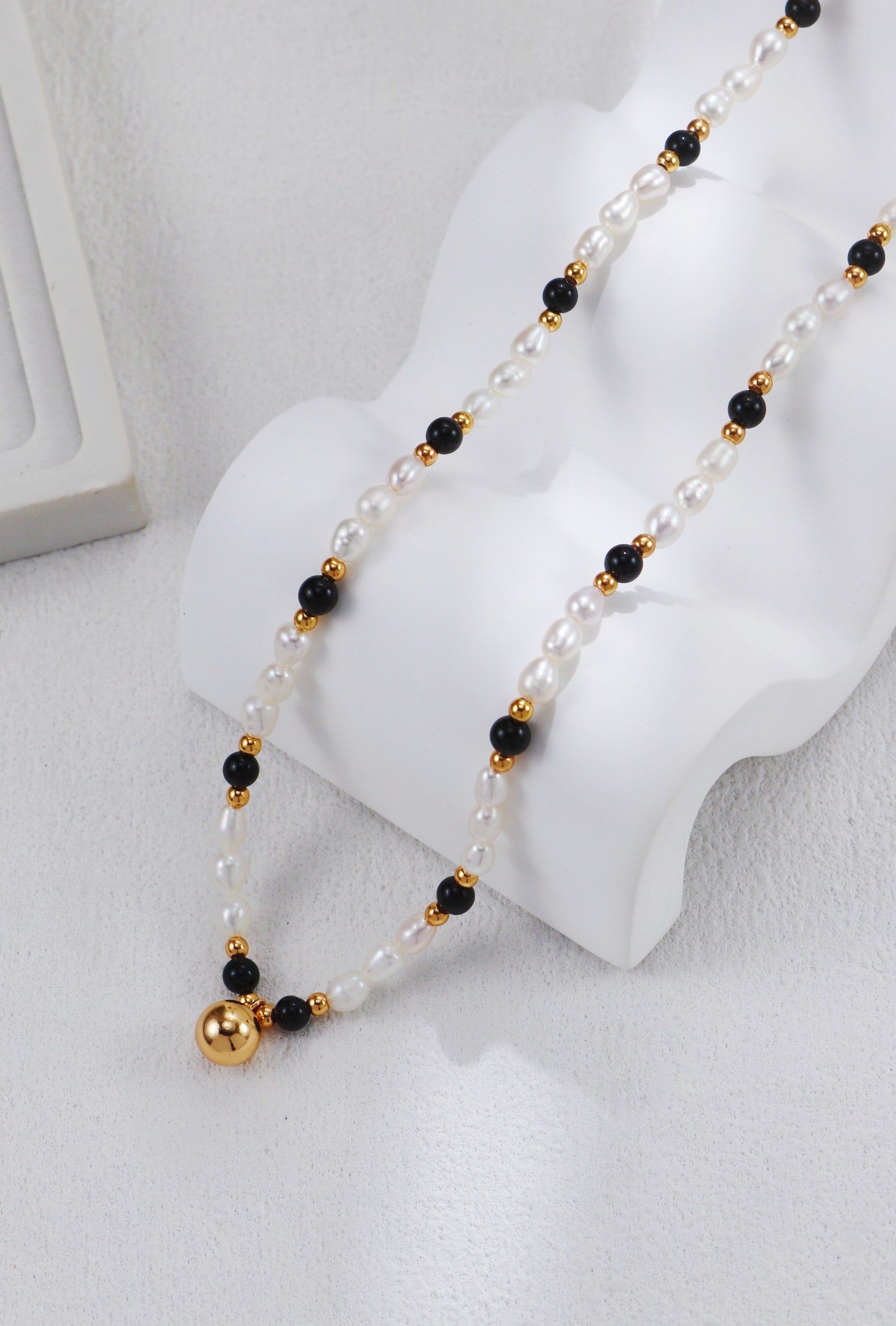 A delicate balance of luminous pearls, deep black beads, and gold accents, finished with a subtle charm. Classic yet modern, perfect for effortless elegance.