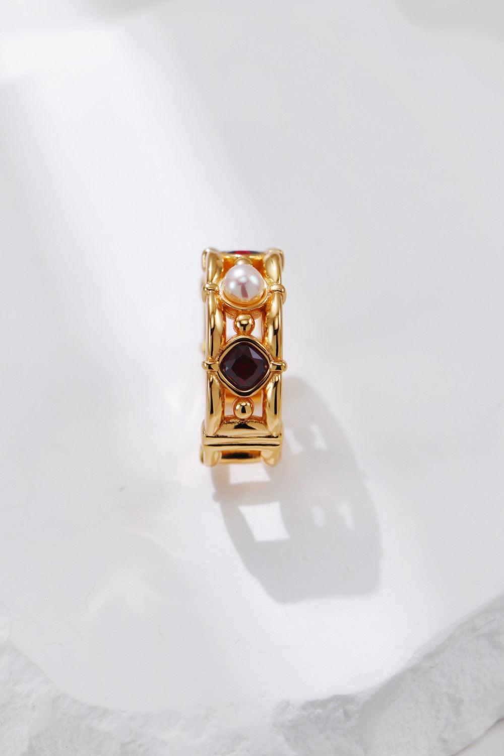 Featuring a lustrous pearl at its center and vibrant red gemstones, this piece blends classic sophistication with a bold, modern twist.