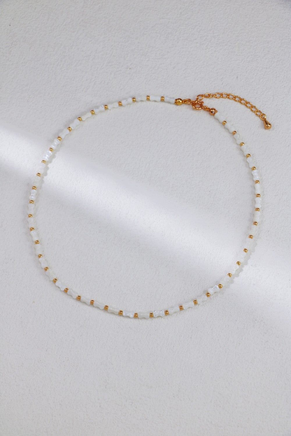 Like moonlight captured in delicate beads, this necklace shimmers with a quiet glow, a whisper of elegance against your skin. Each tiny luminescent stone is a soft reminder of fleeting stardust, held together by golden accents that dance with every movement. A piece made to adorn, enchant, and become a part of your most cherished moments.