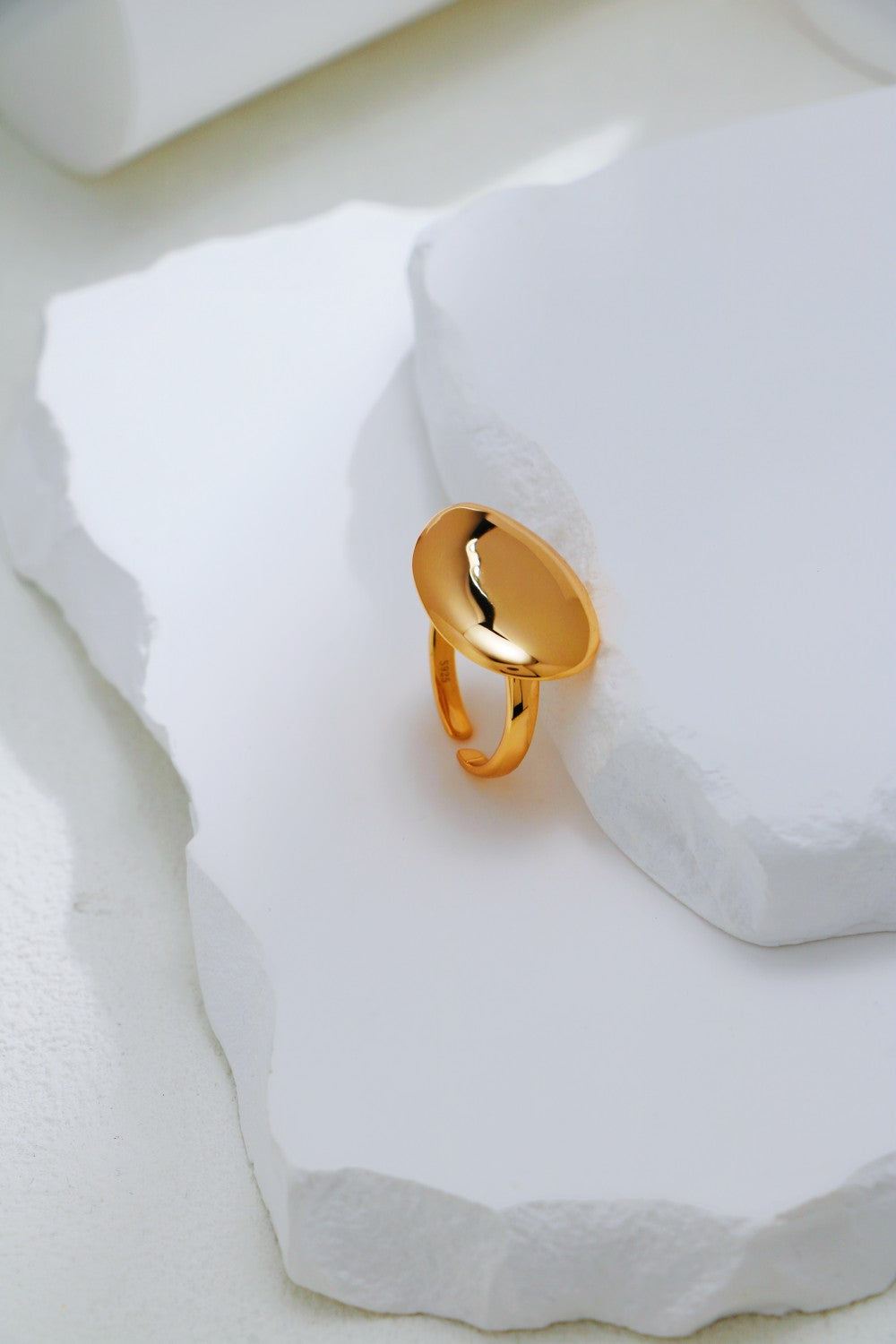 Timeless with a modern edge, this ring draws inspiration from vintage heirlooms while maintaining a contemporary appeal. Its high-shine gold finish and fluid shape create a bold yet wearable statement, reminiscent of antique signet rings reimagined for today. A piece that feels as if it has a story to tell—perhaps yours.