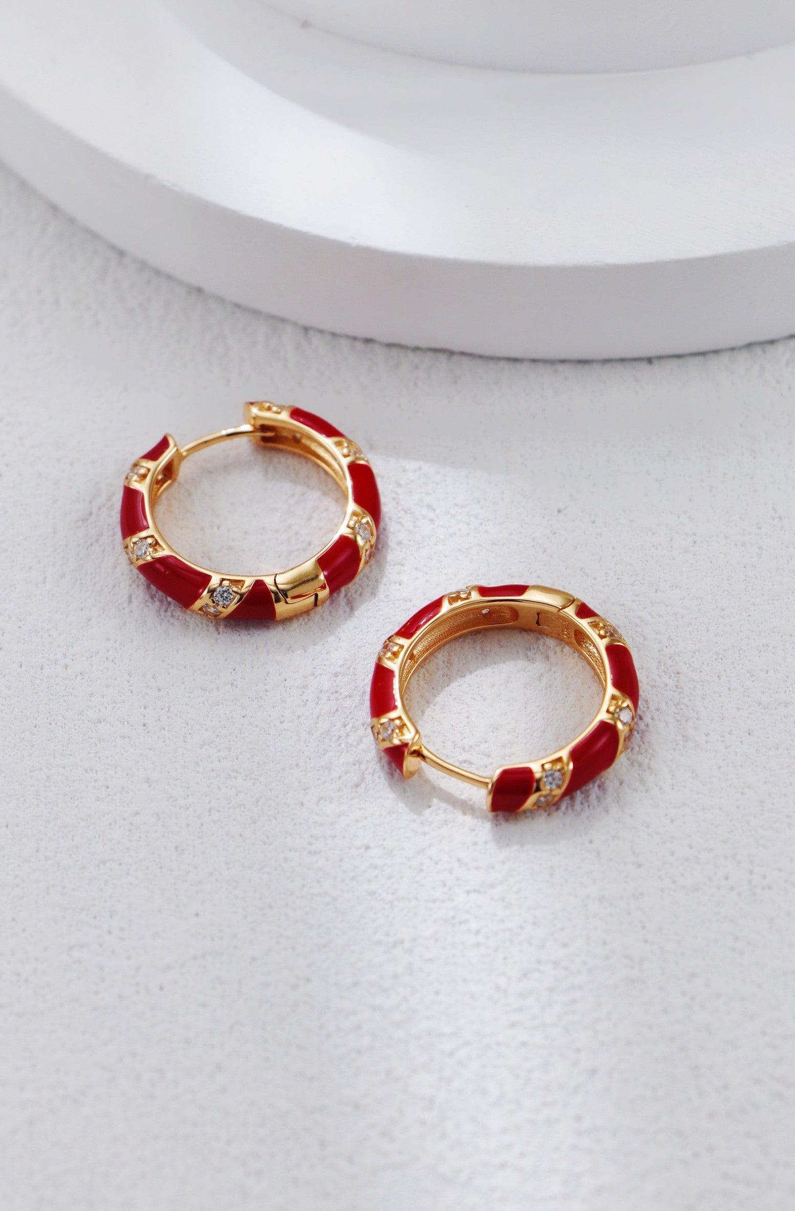 These gold hoop earrings are accented with vibrant red enamel and sparkling crystal details. The bold contrast and intricate design add a playful yet elegant touch, making them perfect for both casual and dressy occasions.