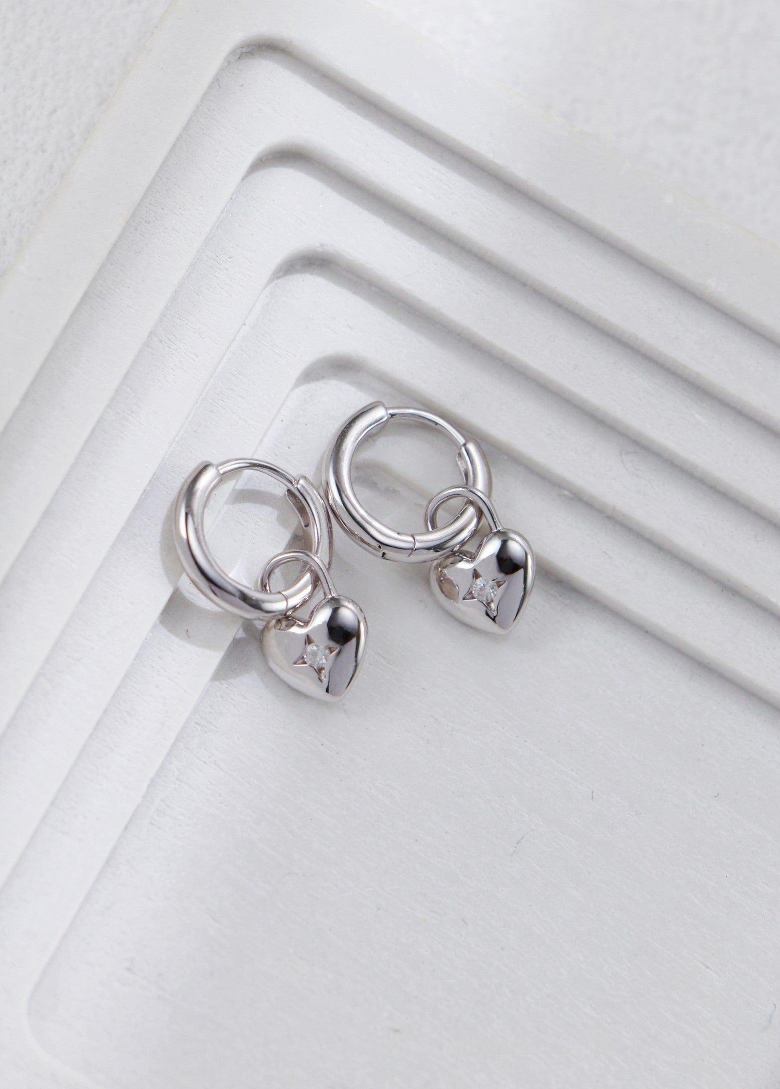 Soft curves meet a touch of sparkle in these beautifully crafted earrings. The polished silver hoops are adorned with dainty heart charms, each featuring a subtle star-set zirconia that catches the light with every movement.